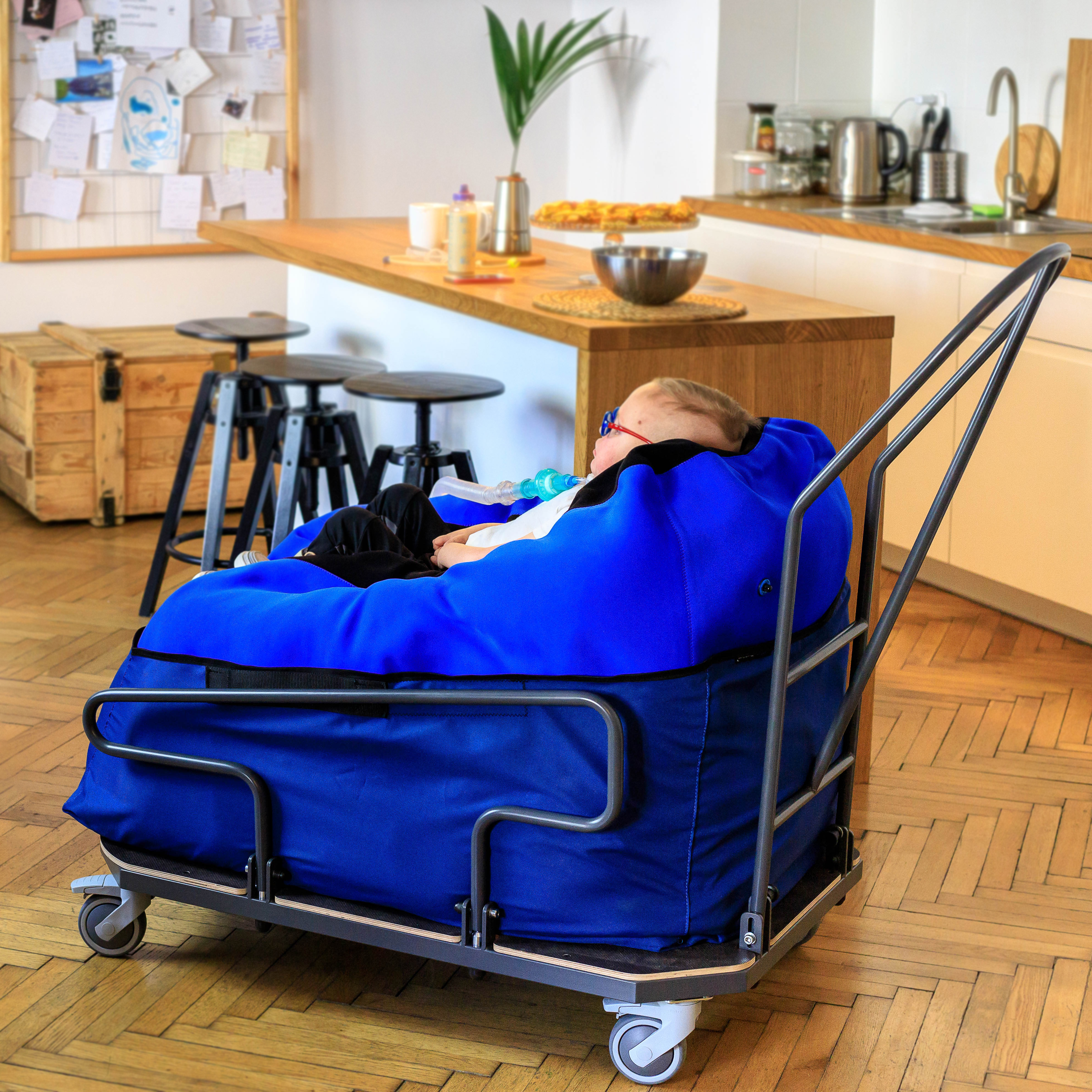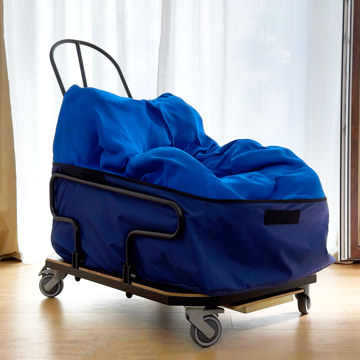 Beanroller to składany wózek transportowy do siedziska Beanseat Stabilo System, ułatwiający bezpieczne przewożenie użytkowników na krótkich dystansach, wyposażony w blokowane koła i wysuwany podnóżek.