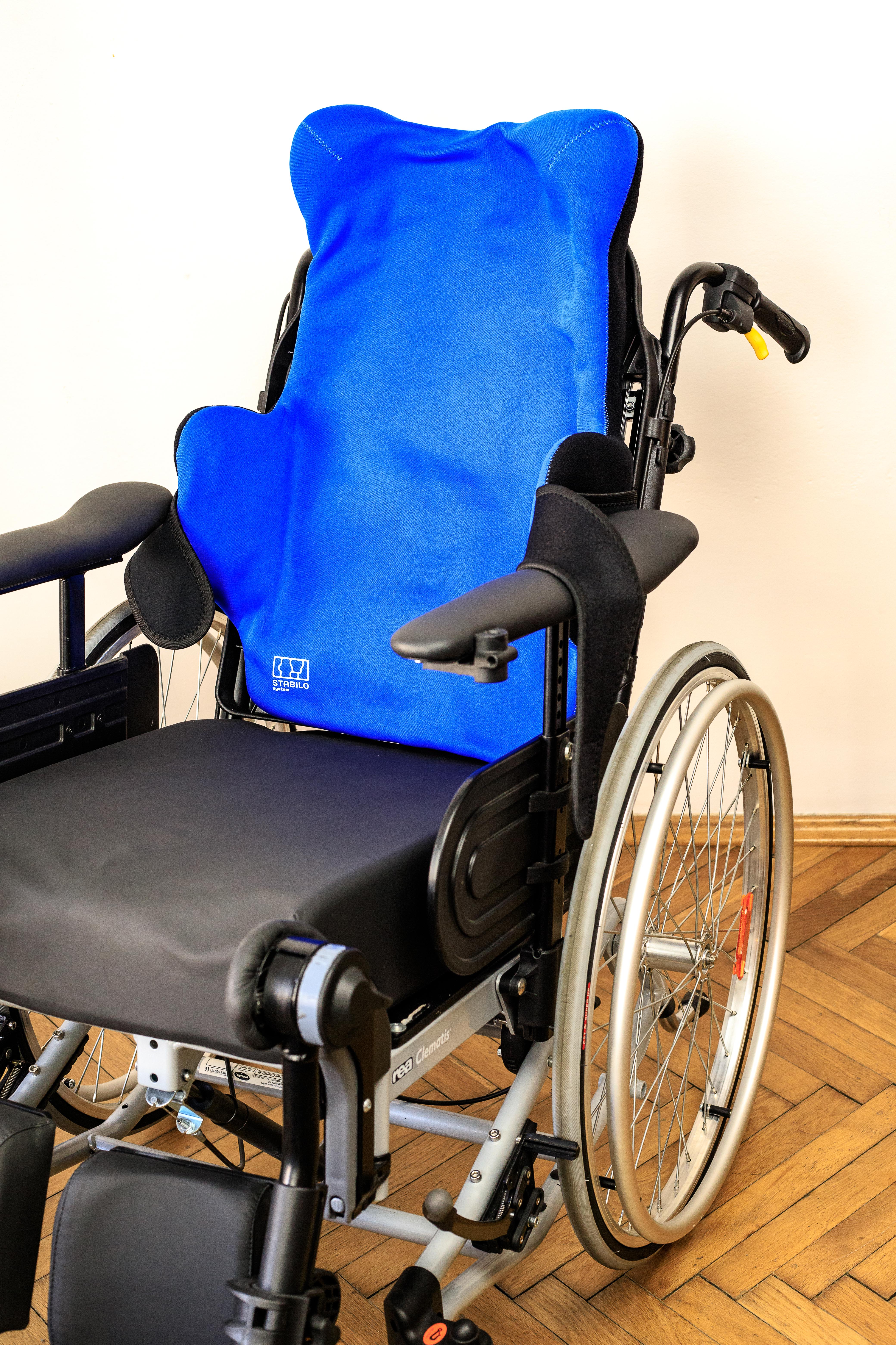 The back-stabilizing cushion with lateral pads provides comfortable support, aids in postural correction, and improves body control. Wide lateral pads and a large headrest stabilize the user, protect the cervical spine, and enable proper head alignment.