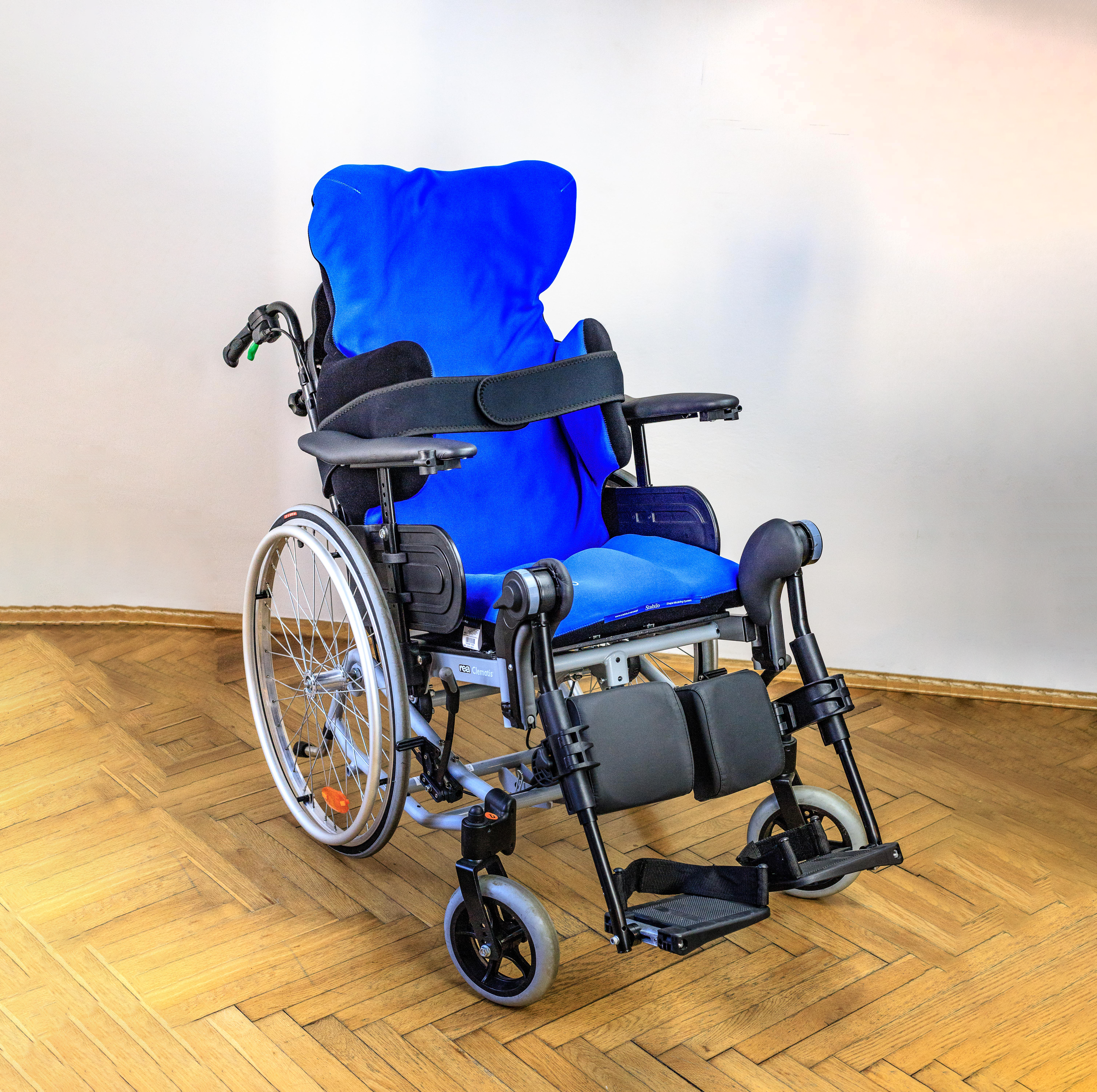The seat with lateral pads and headrest combines the functions of a backrest and seat, offering hip stabilization, spinal curvature correction and head support. The lateral pads, together with a neoprene strap, provide excellent trunk stabilization while relieving muscles and enabling the maintenance of proper posture during sitting.